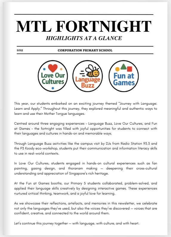 Through a variety of creative language competitions and enrichment sessions, we hope to make language learning more immersive, enjoyable, and relevant. We also aim to deepen students’ appreciation of their Mother Tongue Language and inspire them to use it more confidently in their daily lives.