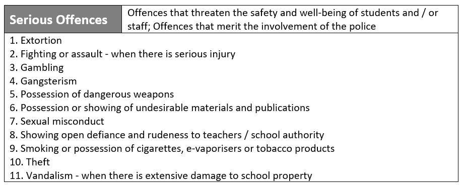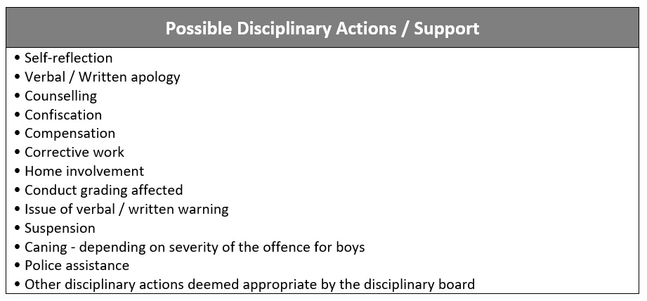 On the day of a student’s absence, the form teacher will contact the parent to check on the student. If a student is absent frequently, the form teacher or other school personnel may conduct a home visit. Should there be no improvement in the student’s attendance, his / her parents will be requested to meet the principal for a discussion.